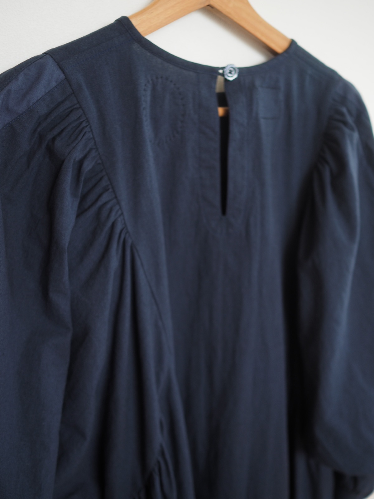 肩の盛り上がりがポイントのブラウススタンド衿と肩タブつきでちょっと個性的な子 落ち着いた雰…