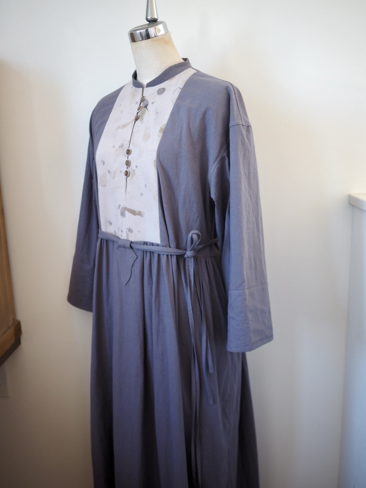 前布は庭の草花の染め布スモークツリー、たまねぎなどパープルグレーなカラーによく似合います …
