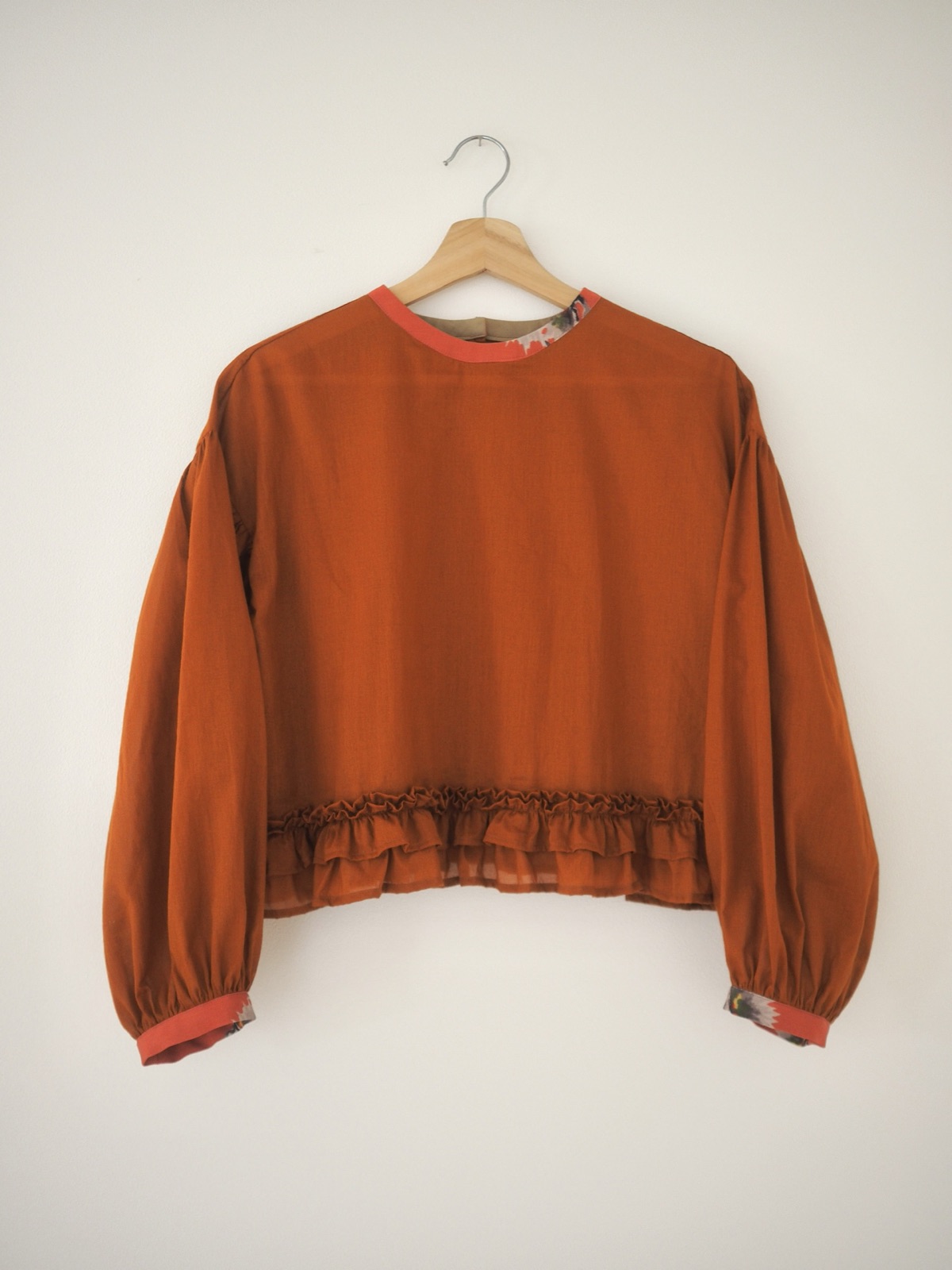 クララブラウス オレンジ 2026年4月23日 お品もの kurara blouse シャツブラウス tomomi nakagawa 上品な光沢とほどよい透け感のあるエアリーな布 軽くて肌触りのよい綿素材です🌬️ ピンクに松模様の着物布を衿ぐりと袖口に合わせました🌟 フリルを二重につけて動きのある裾のデザイン 短丈だからパンツスタイルにもピッタリでーす👍 可愛い〜🥰