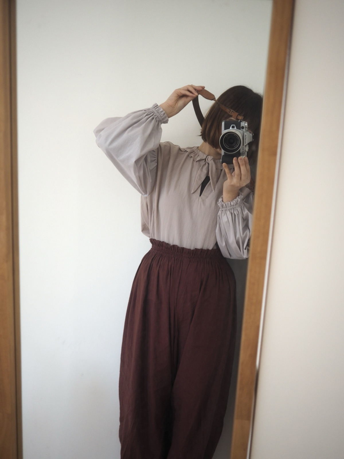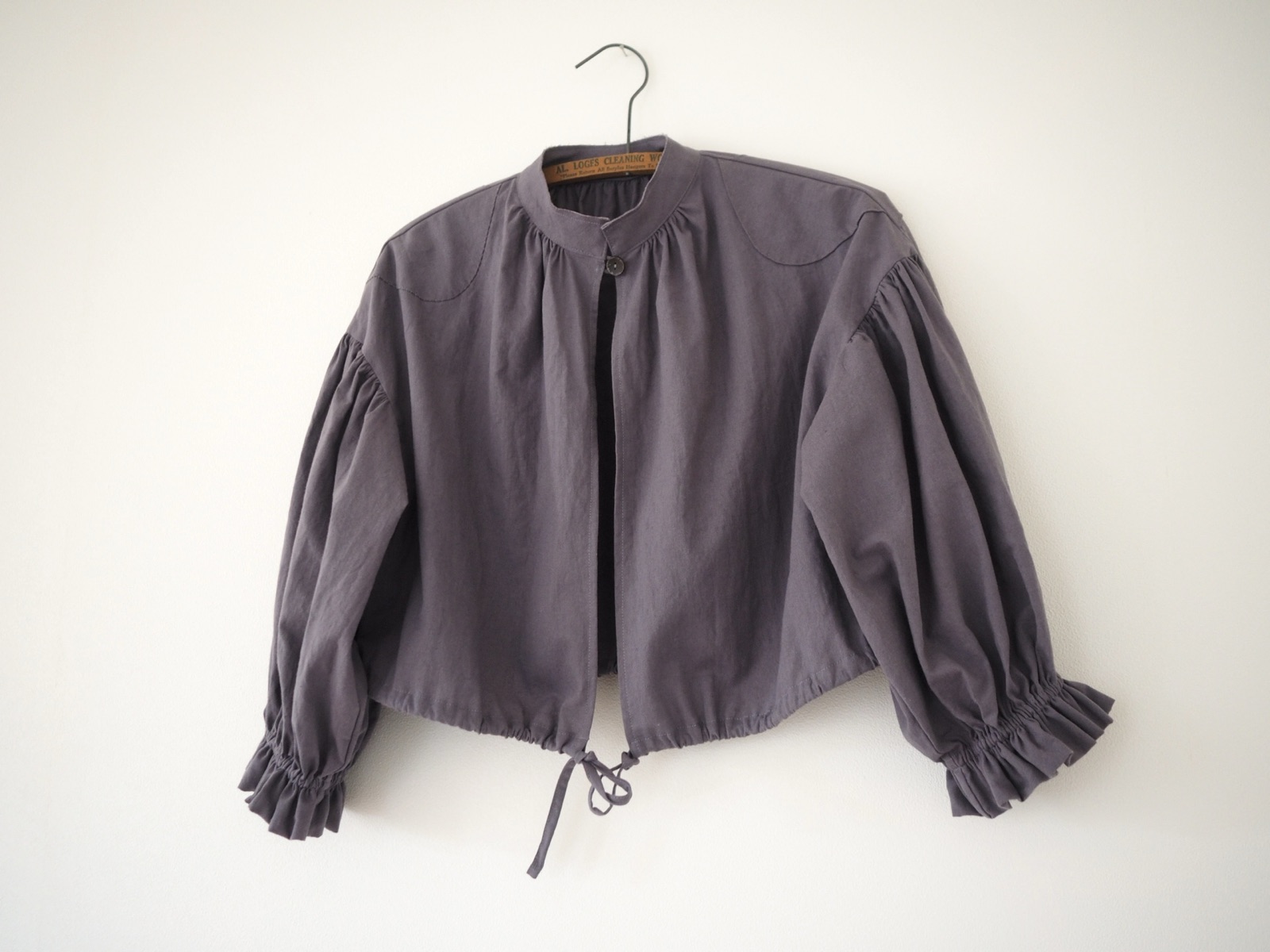 肩の盛り上がりがポイントのブラウススタンド衿と肩タブつきでちょっと個性的な子 落ち着いた雰…